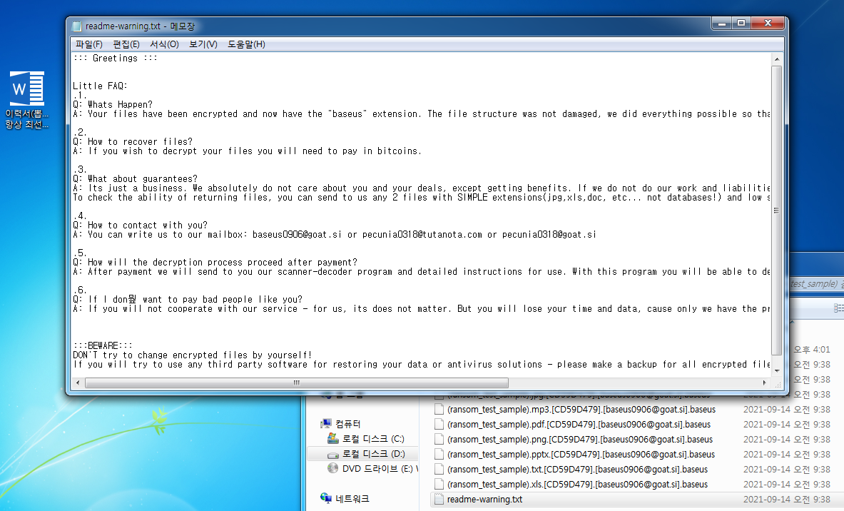 암호화 후 파일 확장자를 [CD59D479].[baseus0906@goat.si].baseus으로 변경하며 'readme-warning.txt' 제목의 랜섬노트를 띄웁니다.