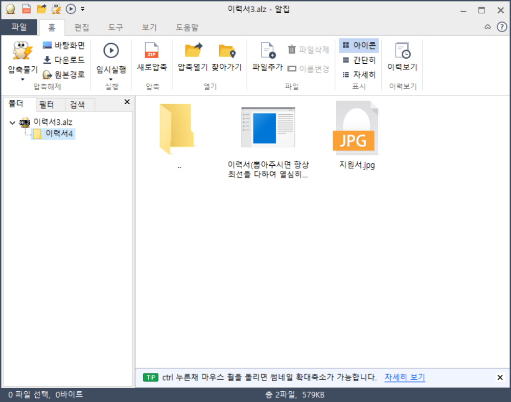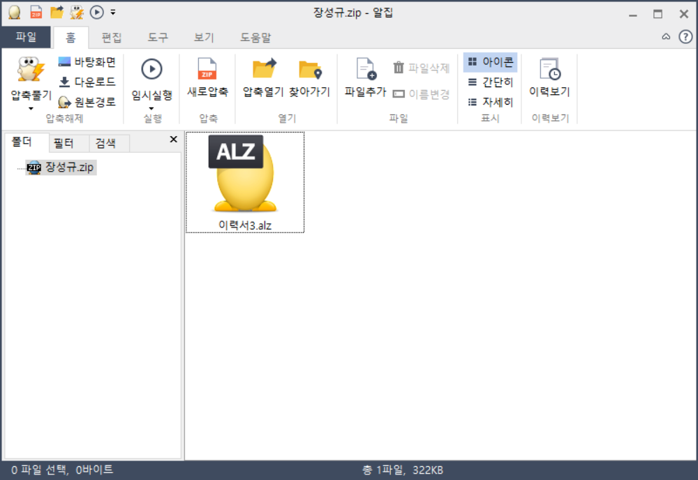 zip 파일 안에 있는 alz 파일 내에는 이력서를 위장한 .exe 파일과 .jpg 파일이 포함되어 있습니다.