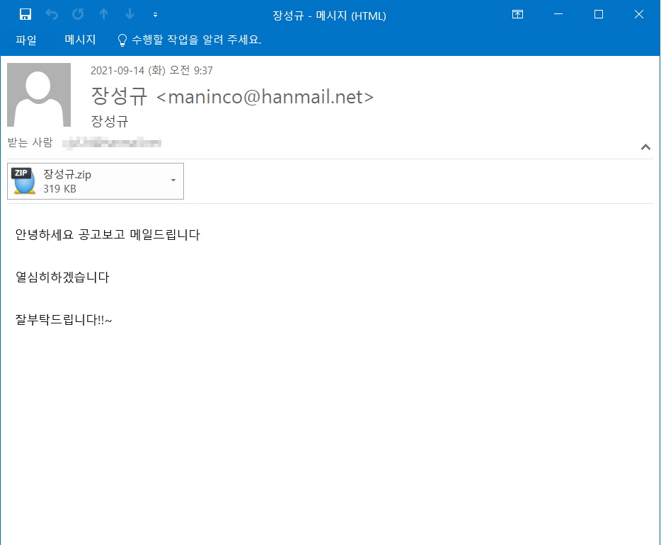 이번에 발견된 악성 메일 내에도 역시 첨부파일이 포함되어 있습니다.