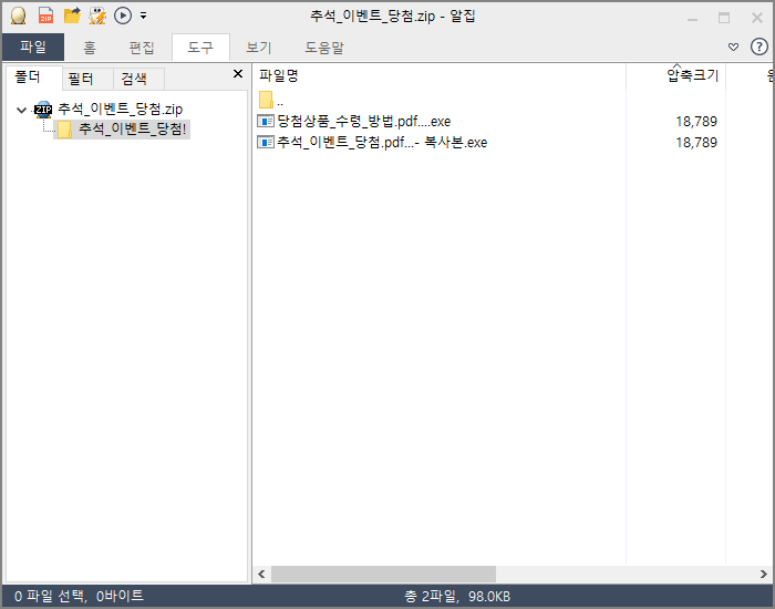 '추석_이벤트_당첨.zip' 파일 내에는 2개의 .pdf 파일을 위장한 실행파일(.exe)이 포함되어 있습니다.