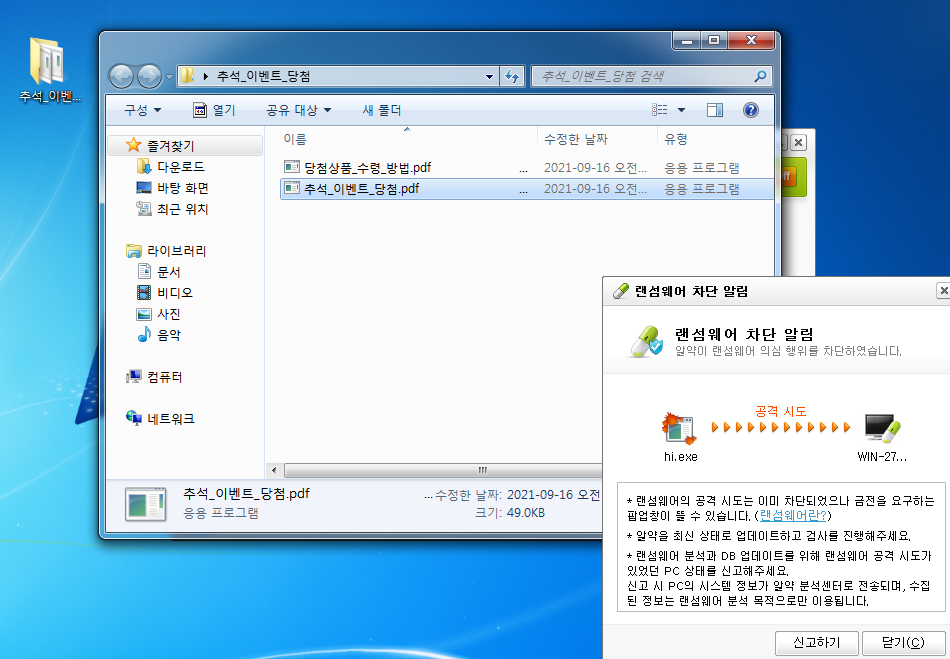 '추석_이벤트_당첨.zip' 파일 내에는 2개의 .pdf 파일을 위장한 실행파일(.exe)이 포함되어 있습니다.