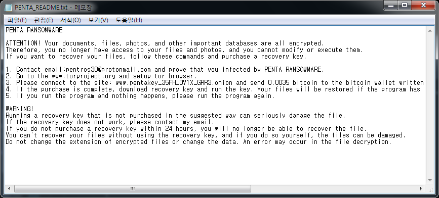 파일 암호화 후 확장자를 [기존 파일명.확장자].PENTA로 변경하며, ‘PENTA_README.txt’ 파일명을 가진 랜섬노트를 띄웁니다.