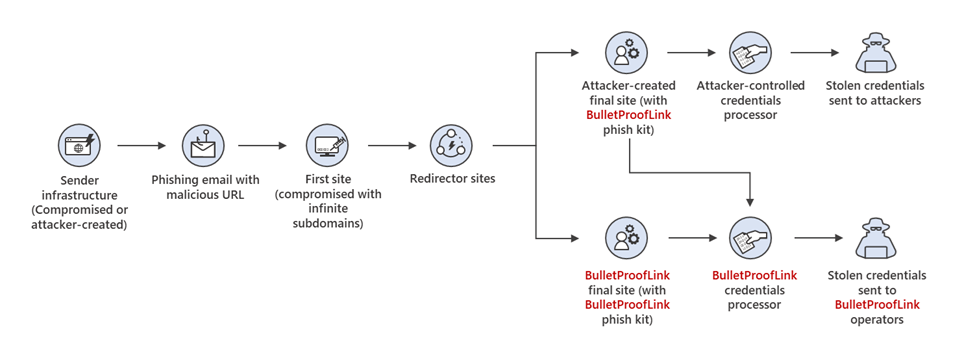 마이크로소프트는 공격자가 제어하는 사이트나 BulletProofLink에서 PhaaS 서비스의 일부로 제공한 사이트에서 BulletProofLink 피싱 키트를 사용한 캠페인을 조사하던 중 해당 공격을 발견했습니다. 이 작업은 2020년 10월 OSINT Fans에서 처음으로 문서화했습니다.