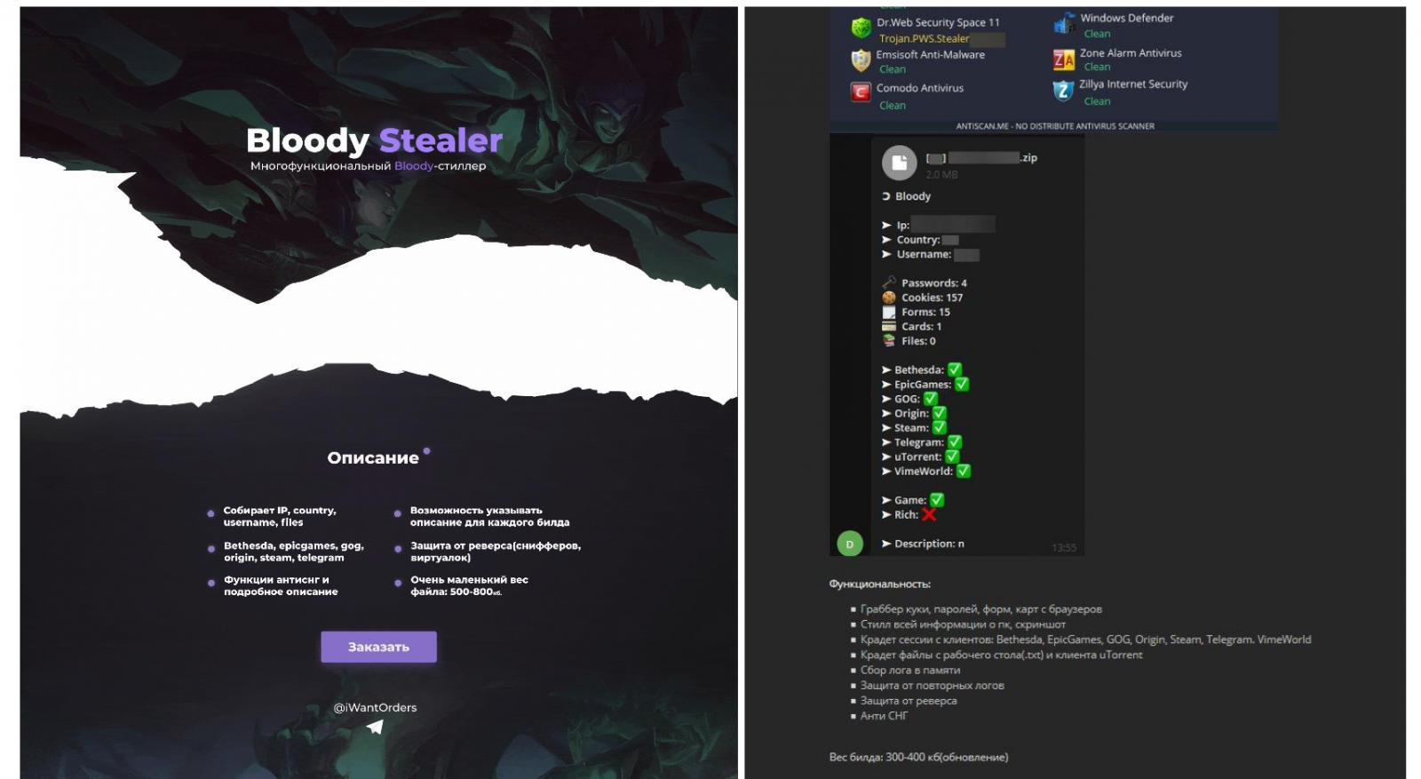 또한 BloodyStealer는 탐지 회피 및 악성코드 분석 보호 기능과 함께 판매됩니다. 개발자가 설명한 이 악성코드의 전체 기능 목록은 아래와 같습니다.