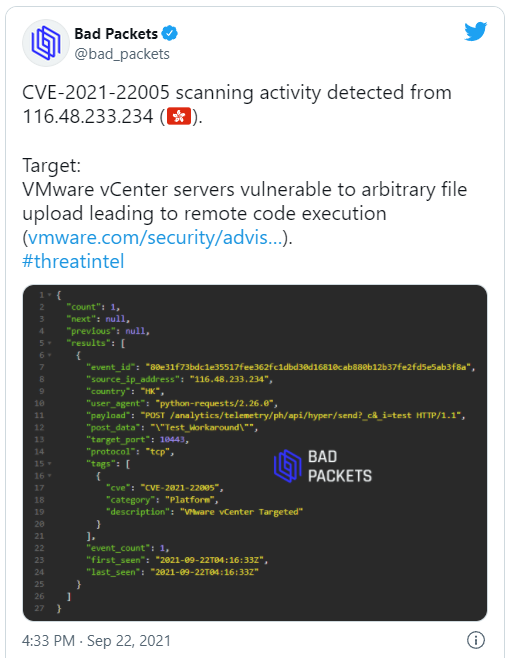 위협 인텔리전스 회사인 Bad Packets는 VMware 측에서 이 취약점을 패치한 직후 공격자가 해당 취약점을 검색하기 시작했다고 밝혔습니다.
