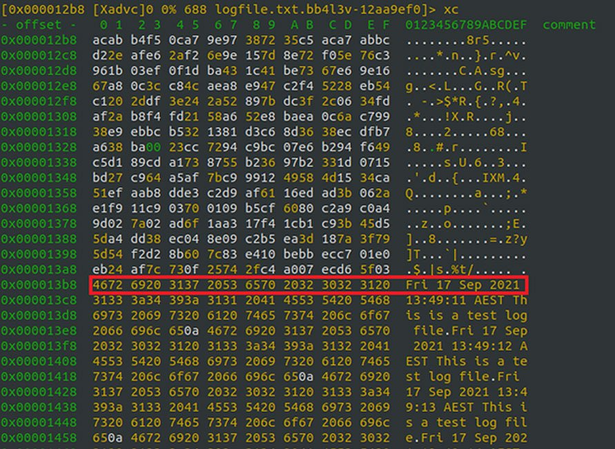 파일을 잠그지 않은 상태에서 다른 프로세스가 리눅스 파일에 쓰는 것과 동시에 랜섬웨어가 리눅스 파일을 암호화하려 시도할 경우, 암호화된 파일에는 아래와 같이 암호화된 데이터와 그 뒤에 추가된 암호화되지 않은 데이터가 모두 포함됩니다.
