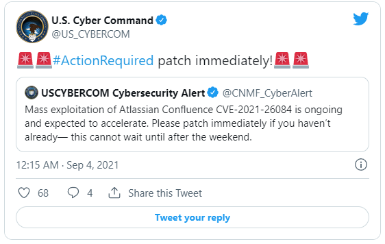 미국 사이버 사령부(USCYBERCOM)는 9월 초에 경보를 발행해 미국 조직에 치명적인 Atlassian Confluence 취약점이 이미 대규모로 악용되고 있으므로 즉시 패치할 것을 촉구했습니다.