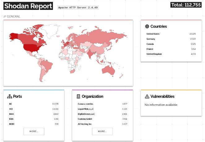 Shodan 검색 결과 온라인에서 Apache HTTP Server 2.4.49 버전이 십만 건 이상 발견되었으며, 이 중 상당수가 취약할 수 있기 때문에 가능한 한 빠른 시일 내 소프트웨어를 업데이트해야 합니다.