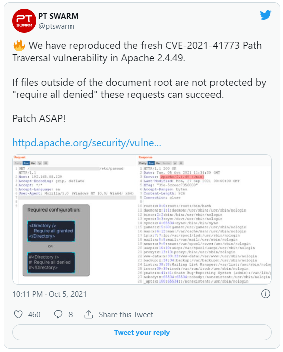 활발히 악용되는 제로데이 취약점은 CVE-2021-41773으로 등록되었으며, 공격자는 취약점을 악용한 경로 탐색 공격을 통해 URL을 예상된 문서 루트 밖에 있는 파일에 매핑할 수 있습니다.