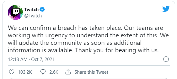 트위치의 소스코드와 스트리머 및 사용자의 민감 정보가 온라인에 유출된 것으로 나타났습니다. 한 익명 사용자가 4chan 이미지 보드에 해당 데이터를 업로드했습니다.