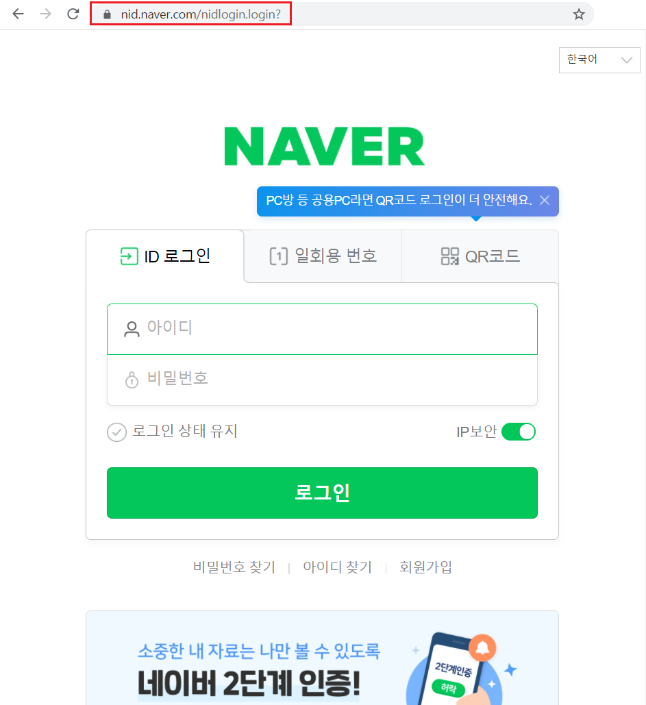 해당 피싱 페이지에서는 사용자의 네이버 계정정보 입력을 유도하여 사용자의 계정정보 유출을 시도합니다.