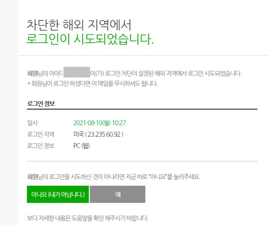 차단한 해외 지역에서 로그인이 시도되었습니다.