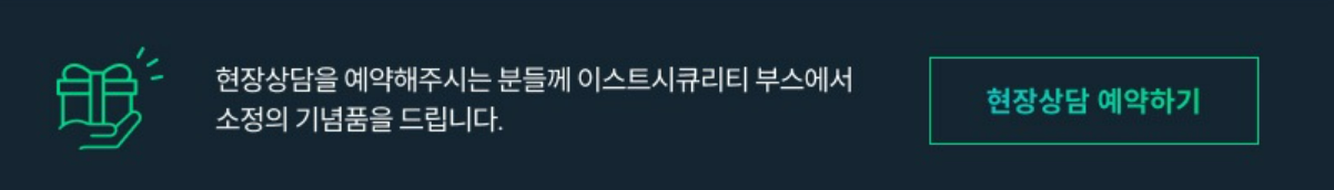 현장 상담을 예약해주시는 분들께는 이스트시큐리티 부스에서 소정의 기념품도 증정해드리고 있으니, 많은 관심과 참석 부탁드립니다!