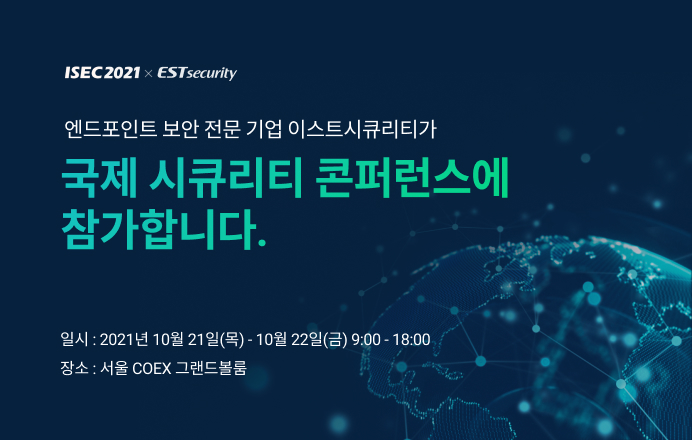 엔드포인트 보안 전문 기업 이스트시큐리티가 오는 10월 21일(목)~22일(금) 양일간 코엑스 그랜드볼룸에서 개최되는 제 15회 국제 시큐리티 콘퍼런스(ISEC 2021)에 참가합니다!