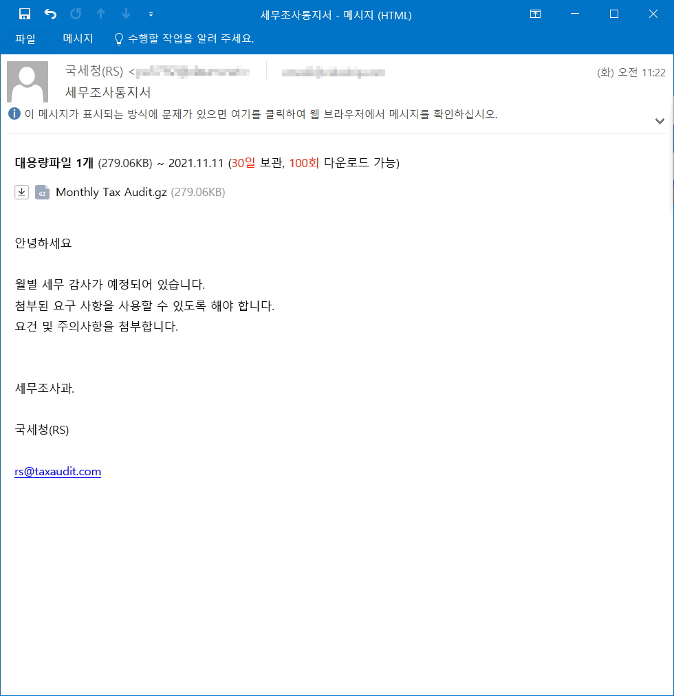 이번 악성 메일은 '세무조사통지서'라는 제목으로 유포되고 있으며, 월별 세무 감사가 예정되어 있다며 첨부되어 있는 파일을 열람하도록 유도합니다.