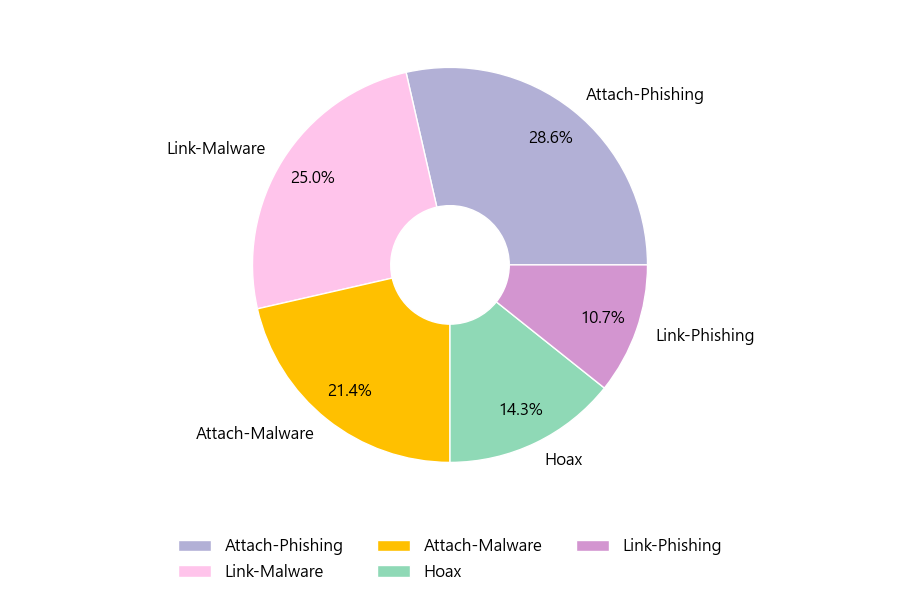 악성 이메일을 유형별로 살펴보면 28건 중 Attach-Phishing형이 28.6%로 가장 많았고 뒤이어 Link-Malware형이 25.0%를 나타냈습니다.
