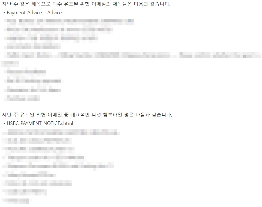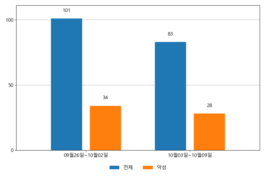지난주 이메일 유입량은 총 83건이고 그중 악성은 28건으로 33.73%의 비율을 보였습니다. 악성 이메일의 경우 그 전주 34건 대비 28건으로 6건이 감소했습니다.