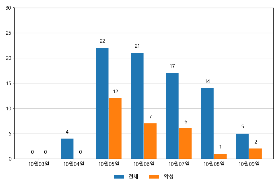 일일 유입량은 하루 최저 4건(악성 1건)에서 최대 22건(악성 12건)으로 일별 편차를 확인할 수 있습니다.