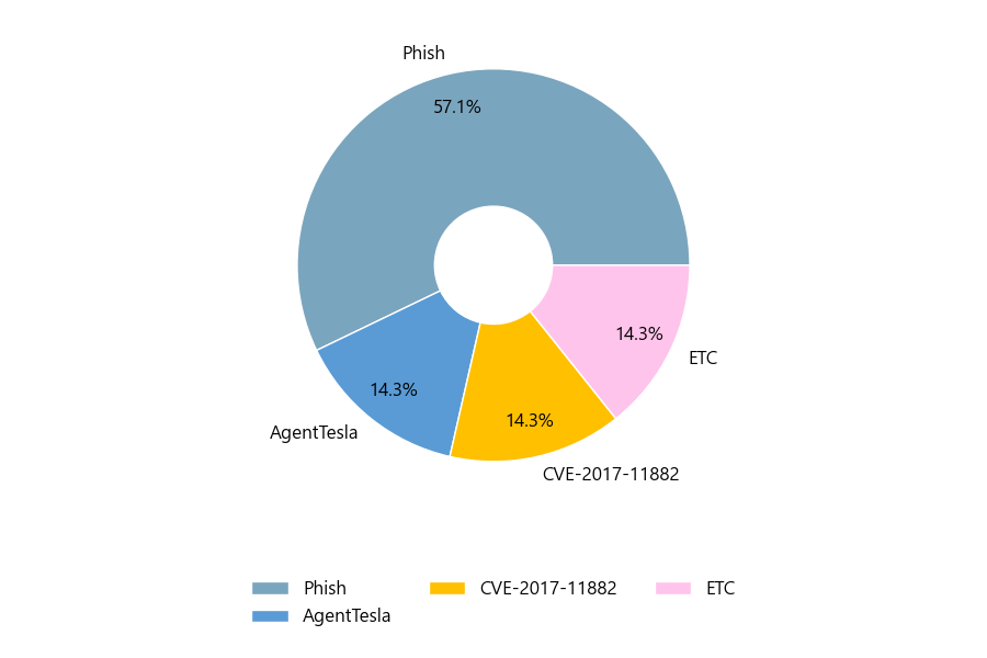 첨부파일은 ‘Phish’형태가 57.1%로 제일 큰 비중을 차지했고 뒤이어 ‘AgentTesla’, ‘CVE-2017-11882’가 각각 14.3%, 14.3%의 비중을 차지했습니다.