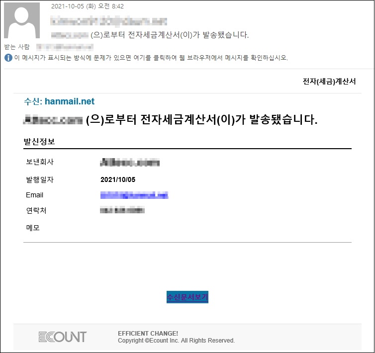 이번주 Pick으로는 ecount 기업을 사칭 개인정보를 훔쳐가는 Phishing 이메일을 선정했습니다. 해당 이메일은 전자세금계산서를 확인하도록 유도하며, 링크 클릭시 제작자가 만든 피싱 사이트로 연결되기 때문에 주의가 필요합니다. 자세한 내용은 다음 글을 확인하시기 바랍니다.