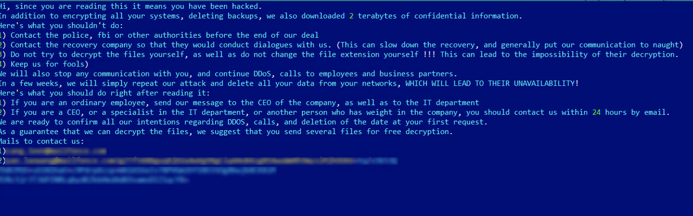 "피해자가 공격자가 정한 규칙을 어길 경우, 공격자는 피해자에게 분산 서비스 거부(DDoS) 공격을 실행하고 직원 및 비즈니스 파트너에게 전화를 걸 것이라 협박했습니다. 또한 범죄자들은 피해자에게 몇 주 내에 공격을 반복하고 피해자의 데이터를 삭제하겠다고 협박합니다. 이는 대부분의 랜섬웨어 운영자가 피해자가 랜섬머니를 지불하도록 협박하기 위해 사용하는 흔한 전략입니다.”