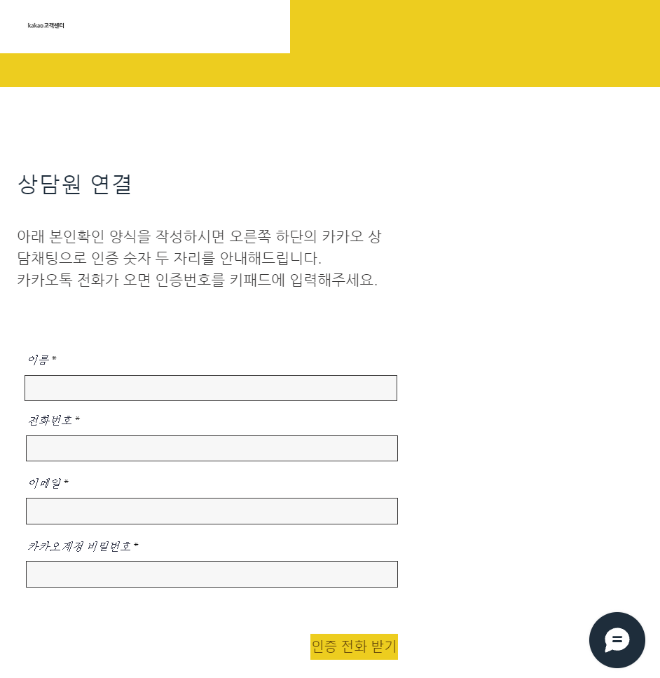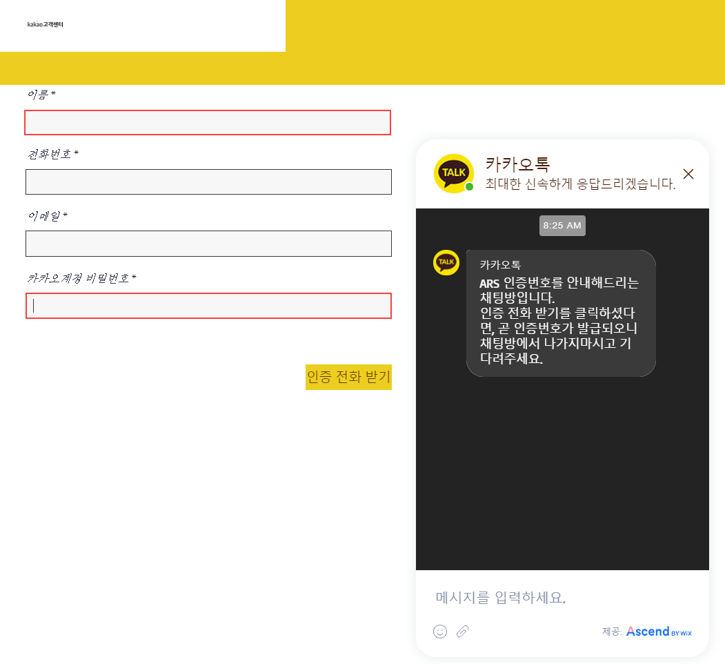 사용자가 상담원 연결란에 이름, 전화번호, 이메일, 카카오계정 비밀번호를 입력 후 인증 전화받기를 누르면 "ARS 인증번호를 안내해드리는 채팅방입니다. 인증 전화받기를 클릭하셨다면, 곧 인증번호가 발급되오니 채팅방에서 나가지마시고 기다려주세요."라는 안내가 뜨며 사용자 정보는 json형태로 공격자 서버로 전송됩니다.