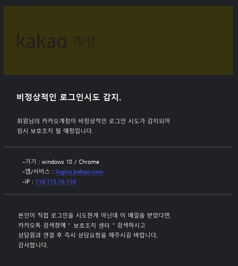본인이 직접 로그인을 시도한게 아닌데 이 메일을 받았다면 카카오 고객센터(링크포함)를 클릭하시고 상담원의 안내에 따라 계정을 보호해주시기 바랍니다.