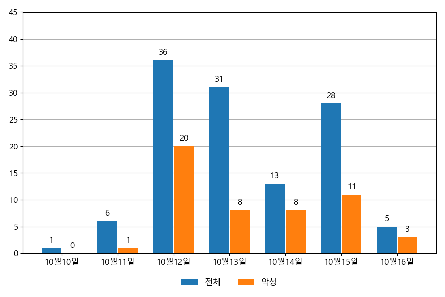 일일 유입량은 하루 최저 1건(악성 1건)에서 최대 36건(악성 20건)으로 일별 편차를 확인할 수 있습니다.