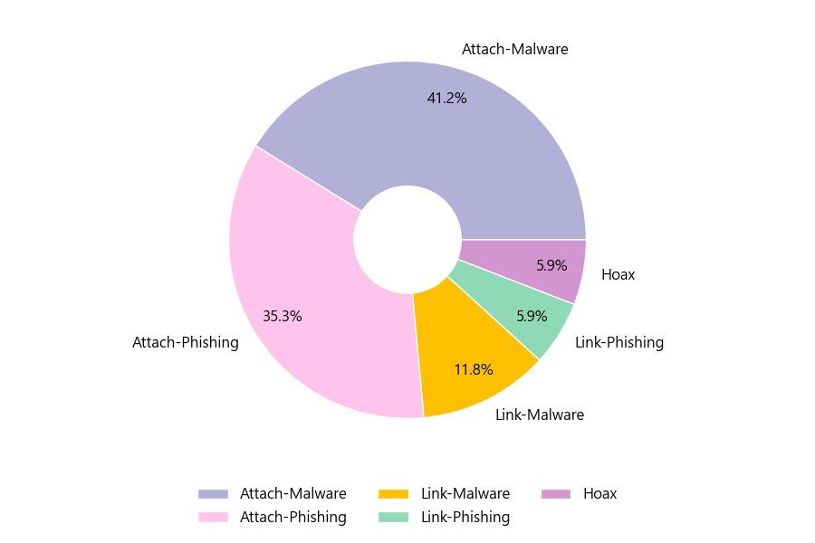 악성 이메일을 유형별로 살펴보면 51건 중 Attach-Malware형이 41.2%로 가장 많았고 뒤이어 Attach-Phishing형이 35.3%를 나타냈습니다.