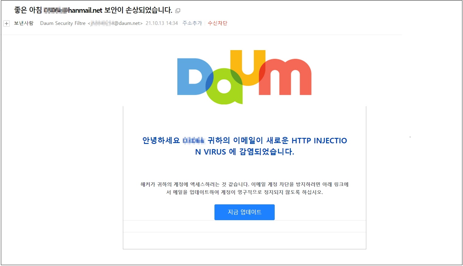 해당 메일은 "좋은아침 *****@hanmail.net" 보안이 손상되었습니다"라는 제목으로 유포되고 있습니다.