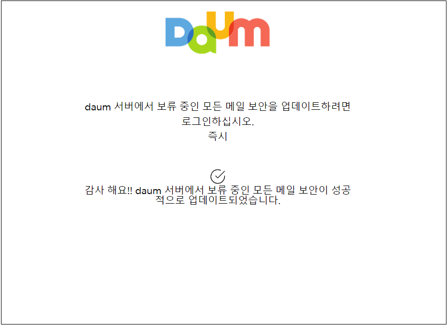 만일 사용자가 실제 daum 페이지로 오인하여 계정정보를 입력하면 입력한 계정정보는 공격자의 서버로 전송된 후 다음과 같은 메세지가 뜨게 됩니다.