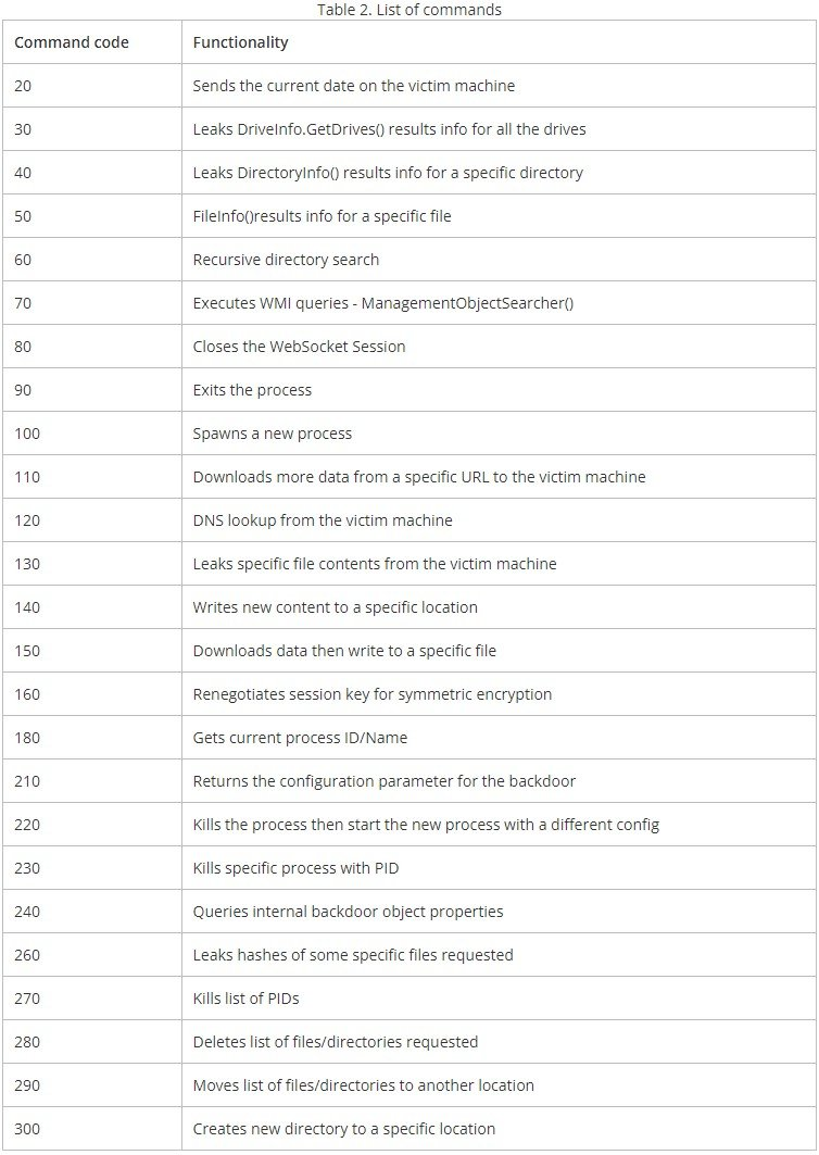 TrendMicro에서 발견한 웹 소켓 명령의 목록은 광범위하며 다양한 변종 간에 일치하지 않는 점이 다소 있지만 아래 표에 모두 요약되어 있습니다.