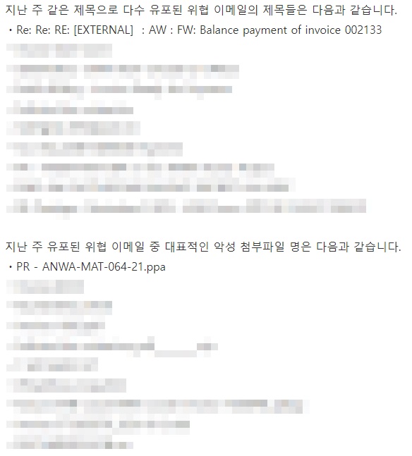 지난주 이메일 유입량은 총 96건이고 그중 악성은 29건으로 30.21%의 비율을 보였습니다. 악성 이메일의 경우 그 전주 51건 대비 29건으로 22건이 감소했습니다.