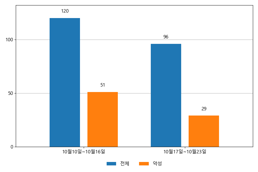 ESRC에서는 자체 운영 중인 이메일 모니터링 시스템의 데이터를 통해 이메일 중심의 공격이 어떻게 이루어지고 있는지 공유하고 있습니다. 다음은 10월 17일~10월 23일까지의 주간 통계 정보입니다.