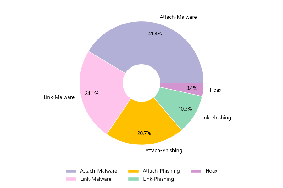 악성 이메일을 유형별로 살펴보면 29건 중 Attach-Malware형이 41.4%로 가장 많았고 뒤이어 Link-Malware형이 24.1%를 나타냈습니다.