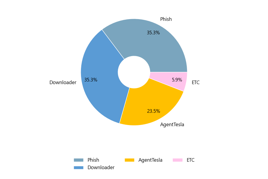 첨부파일은 ‘Phish’형태가 35.3%로 제일 큰 비중을 차지했고 뒤이어 ‘Downloader’, ‘AgentTesla’가 각각 35.3%, 23.5%의 비중을 차지했습니다.