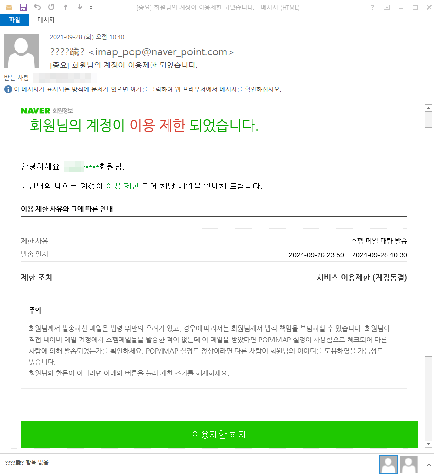 이번주 Pick으로는 계정 이용제한 또는 로그인 제한을 주요 문구로 유포 중인 Phishing 이메일을 선정했습니다. 특히 국내 대표적인 포털 검색 기업을 사칭하여 상대방의 개인정보 기입을 유도하기 때문에 주의가 필요합니다. 자세한 내용은 다음 글을 확인하시기 바랍니다.