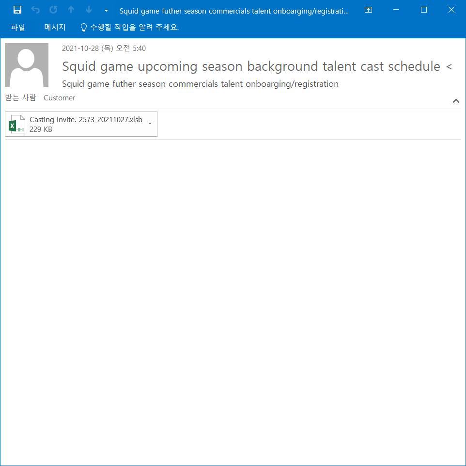 이번에 ESRC에서는 오징어게임 시즌2의 탤런트 캐스팅 일정이라는 제목으로 유포되고 있는 악성 메일을 수집하였습니다.
