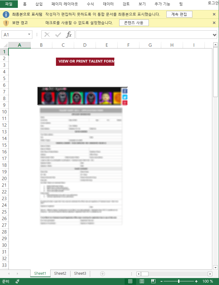 엑셀 파일을 열어보면 오징어게임 TALENT FORM이라는 이미지가 포함되어 있습니다. 공격자는 해당 이미지를 미리보기처럼 흐리게 보이도록 하여 사용자로 하여금 [콘텐츠 사용]을 클릭하도록 유도합니다.