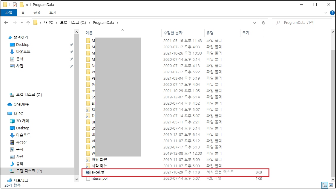 이렇게 내려받은 rtf 파일은c:\ProgramData 폴더 하위에 excel 파일명으로 내려받고 자동 실행합니다.
