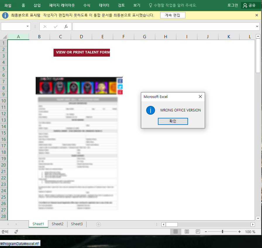 하지만 사용자가 [콘텐츠 사용]을 눌러도 이미지는 동일하게 보이며, 사용자가 이미지를 자세히 보기위하여 해당 이미지를 클릭하면 [WRONG OFFICE VERSION]이라는 메세지가 뜨며 엑셀 파일에 포함되어 있던 매크로가 실행되며 rtf 파일을 내려받습니다.