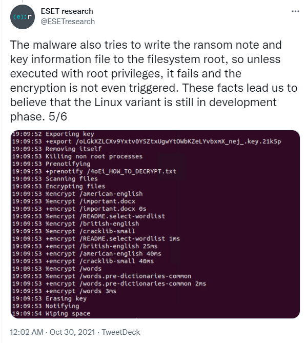 Linux 변종은 일부 버그에 영향을 받는 것으로 보이며 연구원들은 악성코드가 명시적 경로로 실행될 때 암호화 프로세스가 작동하지 않는다는 것을 발견했습니다.