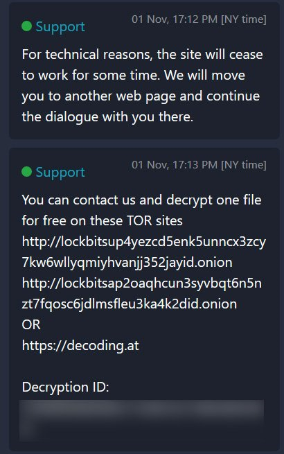 협력 파트너는 기존 BlackMatter의 협상 채팅에서 피해자에게 새로운 협상 페이지가 설정된 LockBit의 Tor 사이트 링크를 제공했습니다.