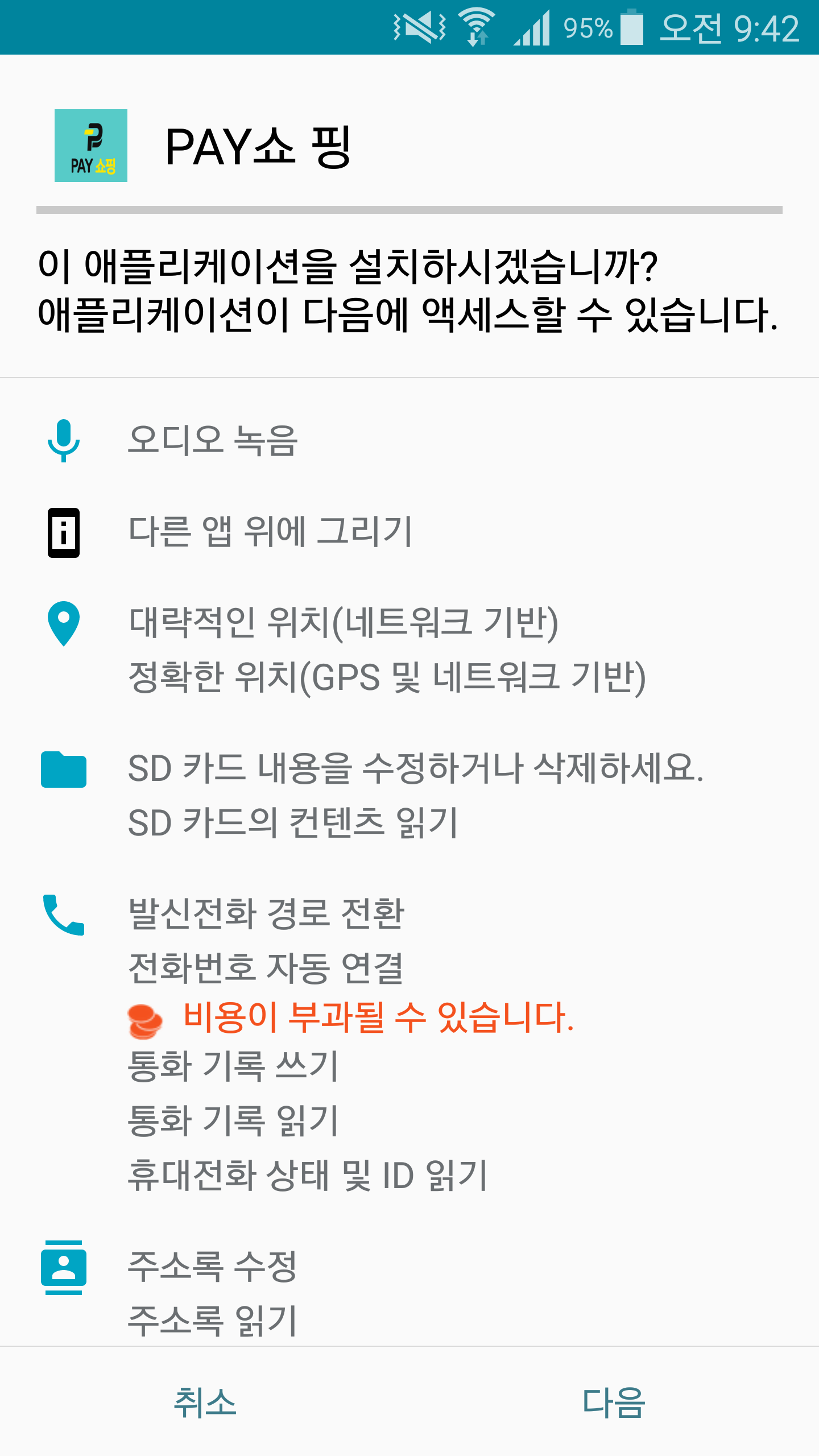 사용자가 해당 앱을 설치하면 다음과 같은 권한을 요구하며, 배터리사용량 최적화 중지와 접근성 허용을 요구합니다.