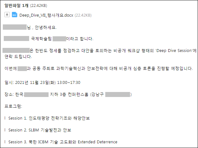 이번 공격은 지난 주에 수행된 것으로 확인됐는데, 실존하는 특정 학술원의 안보전략 심층 토론 내용처럼 위장했습니다.