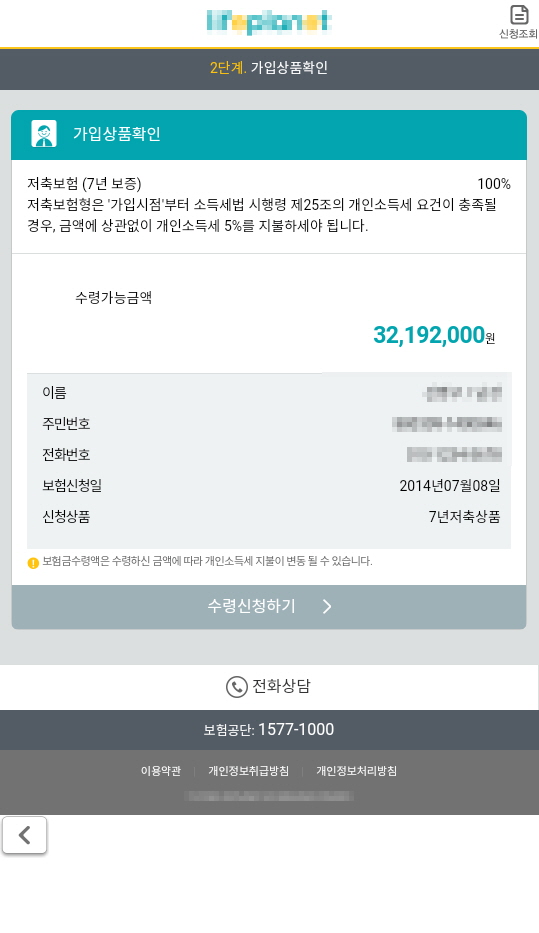 만일 사용자가 앱에서 요구하는 정보들을 모두 입력 후 가입상품 확인하러 가기를 누르면 입력한 정보들을 공격자의 서버로 전송됨과 동시에 수령신청 페이지로 이동하여 수령가능금액 32,192,000원이 보여지게 됩니다. 이때 보여지는 화면은 입력된 정보와는 상관없이 동일하게 보여집니다.