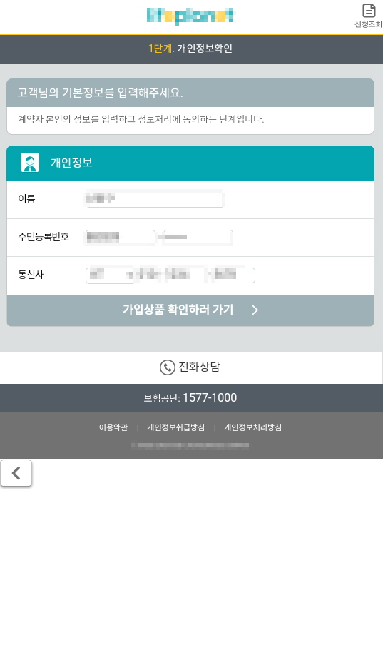 사용자가 생년월일과 성별 정보를 입력 후 보험료 확인을 누르면 개인정보처리 동의를 이유로 이름, 주민등록번호, 통신사 정보 입력을 유도합니다.