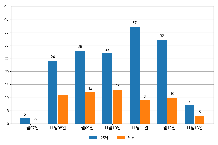 일일 유입량은 하루 최저 3건(악성 1건)에서 최대 39건(악성 12건)으로 일별 편차를 확인할 수 있습니다.